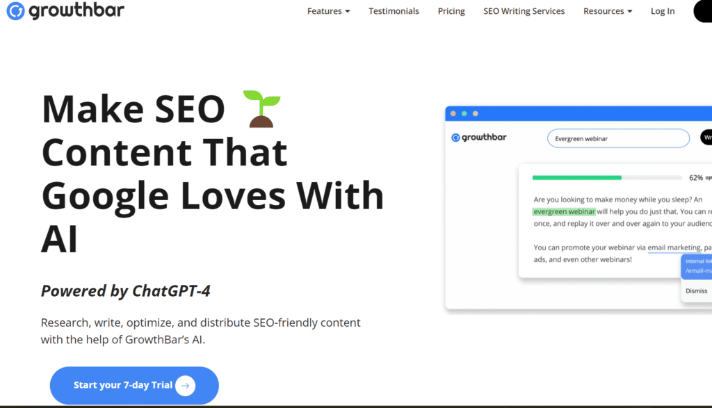 It is an AI writing & SEO tool designed to streamline the process of keyword research, content generation, and competitive analysis for SEO optimization. The tool is designed to optimize content for search engines, ensuring that the generated content is optimized for search engine results pages (SERPs). It offers a 7-day free trial and a 100% money-back guarantee.